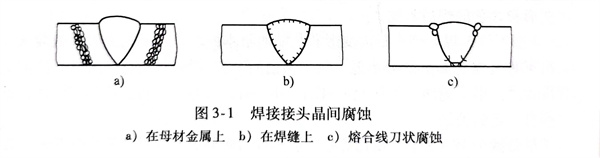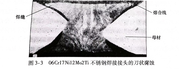 在18-8型不(bu)銹鋼的焊縫金屬中滲入穩定化合金元素鈦、鈮、鋯等,可以消除圖3-1a和圖3-1b兩種形式的晶(jing)間腐蝕,但又可能會出現如圖3-1c中的腐蝕現象,即順著焊縫金屬的熔合線發生像刀切一樣的腐蝕,稱它為刀狀腐蝕。刀狀腐蝕是順著焊縫熔合線向板厚度方向深人,并慢慢地向母材金屬和焊縫金屬發展,如圖3-3所示。刀狀腐蝕將成為制約焊接結構使用壽命的薄弱環節。