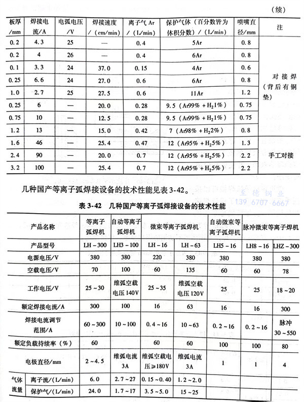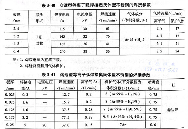 表3-40、表3-41為穿透型和熔透型等離子弧焊接奧氏體不銹鋼的焊接參數。
