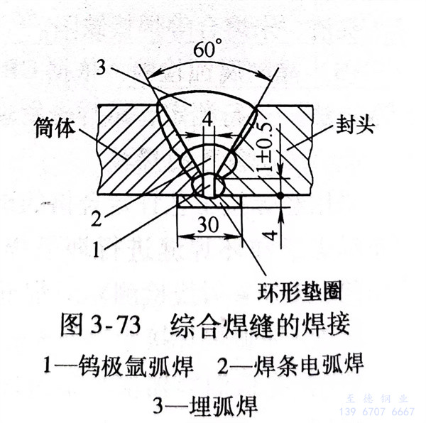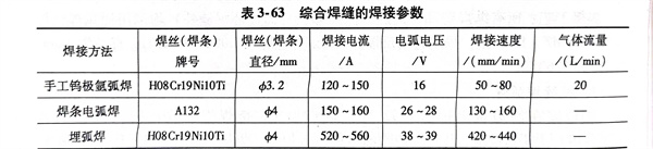 內(nei)容器(qi)(qi)是一(yi)個密(mi)封容器(qi)(qi)(除輸入、輸出液管路(lu)外(wai)),沒有人孔(kong)裝置,焊(han)(han)(han)(han)接設備(bei)和(he)人員無法進(jin)(jin)(jin)入容器(qi)(qi)內(nei)操作。采(cai)用(yong)(yong)的(de)焊(han)(han)(han)(han)接工(gong)藝如(ru)圖(tu)3-73所示。內(nei)環縫(feng)增加了一(yi)個環形墊圈,材質與內(nei)容器(qi)(qi)材質相同,墊圈厚度為4mm,寬(kuan)度為30mm。先用(yong)(yong)鎢極氬弧(hu)焊(han)(han)(han)(han)進(jin)(jin)(jin)行(xing)打底焊(han)(han)(han)(han),保證焊(han)(han)(han)(han)透(tou)實(shi)現(xian)單面(mian)焊(han)(han)(han)(han)雙面(mian)成(cheng)形,通(tong)過100%射(she)(she)線(xian)檢測(ce)(ce)(ce)判片合(he)格后(hou),進(jin)(jin)(jin)行(xing)第2層焊(han)(han)(han)(han)條電弧(hu)焊(han)(han)(han)(han),其目的(de)是提高焊(han)(han)(han)(han)縫(feng)厚度,防止埋弧(hu)焊(han)(han)(han)(han)時由于熔深過大而將(jiang)打底焊(han)(han)(han)(han)焊(han)(han)(han)(han)縫(feng)焊(han)(han)(han)(han)穿。第3層環形焊(han)(han)(han)(han)縫(feng)用(yong)(yong)埋弧(hu)焊(han)(han)(han)(han)完成(cheng)。各層焊(han)(han)(han)(han)縫(feng)的(de)焊(han)(han)(han)(han)接參(can)數見(jian)表3-63。焊(han)(han)(han)(han)后(hou)將(jiang)環焊(han)(han)(han)(han)縫(feng)進(jin)(jin)(jin)行(xing)滲透(tou)檢測(ce)(ce)(ce)和(he)射(she)(she)線(xian)檢測(ce)(ce)(ce)合(he)格后(hou)再進(jin)(jin)(jin)行(xing)無油干(gan)燥(zao)氣壓試驗和(he)氮質譜(pu)真空檢漏。全部滿(man)足(zu)圖(tu)樣技術性能要求(qiu)后(hou)才能與外(wai)容器(qi)(qi)進(jin)(jin)(jin)行(xing)組(zu)裝。