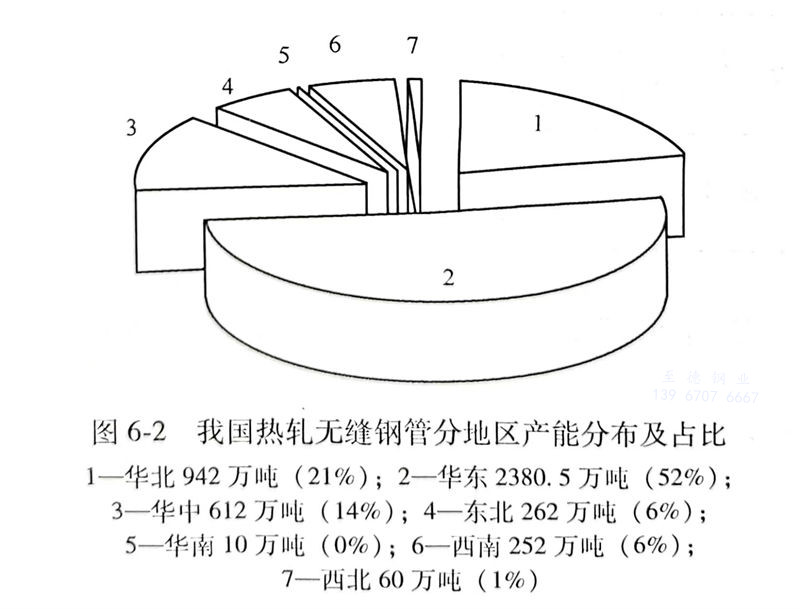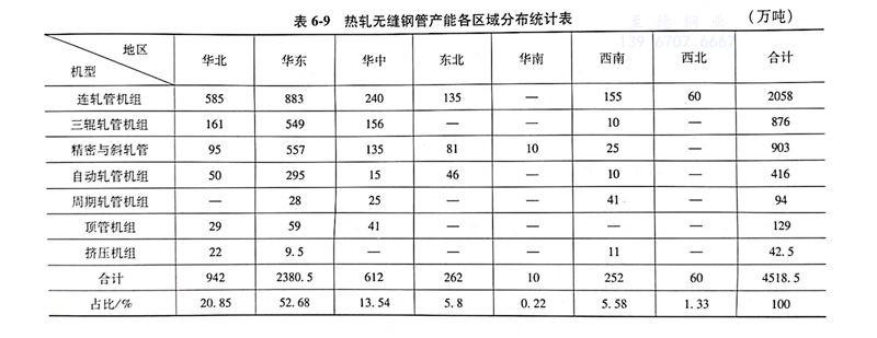 在我(wo)國4519萬噸(dun)(含(han)關(guan)停(ting)機組(zu)(zu))熱軋無縫(feng)鋼(gang)管(guan)(guan)(guan)機組(zu)(zu)產(chan)(chan)能中,華(hua)北地區(qu)(qu)產(chan)(chan)能942萬噸(dun),占比(bi)20.85%;華(hua)東地區(qu)(qu)產(chan)(chan)能高(gao)(gao)達2388.5萬噸(dun),占比(bi)52.87%;華(hua)中地區(qu)(qu)產(chan)(chan)能612萬噸(dun),占比(bi)13.54%;東北地區(qu)(qu)產(chan)(chan)能262萬噸(dun),占比(bi)5.8%;西南地區(qu)(qu)產(chan)(chan)能252萬噸(dun),占比(bi)5.58%;其(qi)他地區(qu)(qu)產(chan)(chan)能70萬噸(dun),占比(bi)1.55%,見表(biao)6-9、圖(tu)6-2所(suo)示。華(hua)東地區(qu)(qu)是我(wo)國熱軋無縫(feng)鋼(gang)管(guan)(guan)(guan)機組(zu)(zu)產(chan)(chan)能最(zui)高(gao)(gao)的(de)區(qu)(qu)域,其(qi)區(qu)(qu)域內(nei)的(de)山東省、江蘇省是我(wo)國熱軋管(guan)(guan)(guan)無縫(feng)鋼(gang)管(guan)(guan)(guan)產(chan)(chan)量(liang)最(zui)多的(de)兩個省份。
