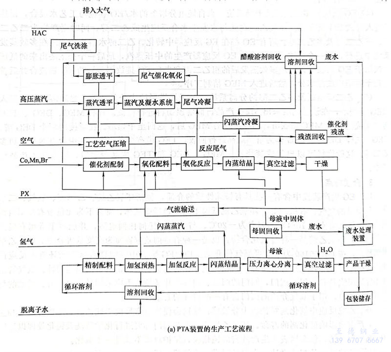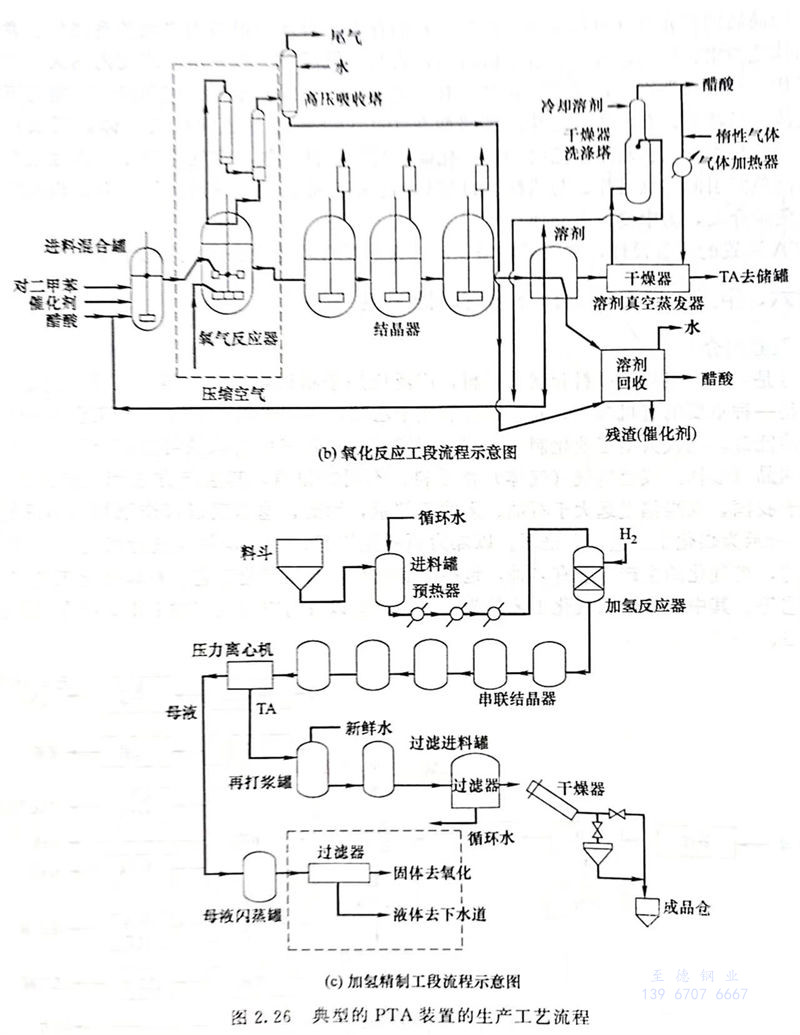 目前世界上普遍采用(yong)對二甲(jia)苯(PX)空(kong)氣氧化法工藝(yi)(yi)。該(gai)工藝(yi)(yi)一般由粗(cu)對苯二甲(jia)酸(suan)的(de)氧化生成(cheng)和對苯二甲(jia)酸(suan)的(de)加氫(qing)精制(zhi)兩部分(fen)組成(cheng),其中(zhong),粗(cu)對苯二甲(jia)酸(suan)的(de)氧化生成(cheng)又(you)包括(kuo)氧化、分(fen)離(li)干(gan)燥(zao)和醋酸(suan)回收(shou)三個(ge)系(xi)統。對苯二甲(jia)酸(suan)的(de)加氫(qing)精制(zhi)又(you)包括(kuo)加氫(qing)精制(zhi)和分(fen)離(li)干(gan)燥(zao)兩個(ge)系(xi)統。典型的(de)PTA裝置的(de)生產工藝(yi)(yi)流程如圖(tu)2.26所示。