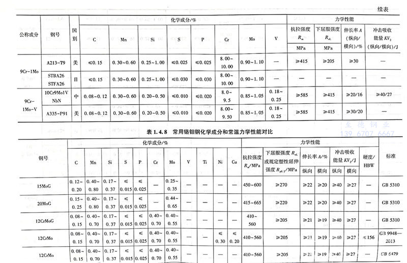 常(chang)用鉻鉬鋼化學成分(fen)和(he)常(chang)溫力(li)學性能(neng)對比見表1.4.8。