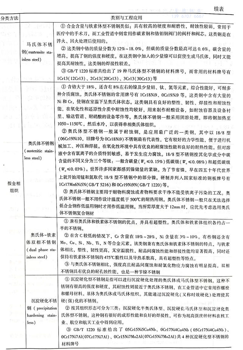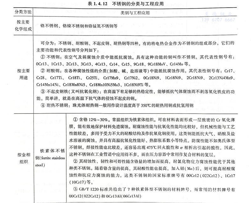 不銹鋼是一種以鐵和碳為基礎的含有較多合金元素的高合金鋼,具有不易生銹的特點,但是,不是絕對的不生銹,而是生銹量、被腐蝕量少,生銹和被腐蝕的過程較慢,甚至根本不能察覺。不銹鋼(gang)鋼(gang)號(hao)中碳含量以千分之幾表示。例如“1Cr13”鋼的平均碳含量為0.1%;若鋼中含碳量≤0.03%或≤0.08%者,鋼號前分別冠以“00”及“0”表示之,例如0Cr18Ni9(06Cr19Ni10)為不銹(xiu)鋼牌(pai)號,牌號表示鋼材中的主要合金元素的百分含量,C≤0.08%,Cr=17.00%~19.%~19.00%,Ni=8.00%~11.00%。不銹鋼的分類與工程應用見表1.4.12。