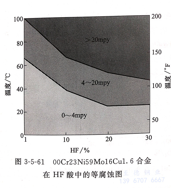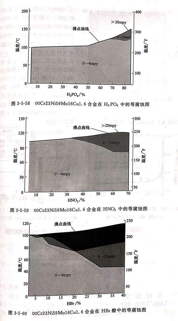 圖3-5-56~圖3-5-61系00Cr23Ni59M016Cu1.6合金在(zai)硫酸(suan)、鹽酸(suan)、磷酸(suan)、硝酸(suan)、氫溴酸(suan)、氫氟酸(suan)等酸(suan)中(zhong)的(de)等腐蝕圖。可(ke)以看出,無論在(zai)氧化性(xing)酸(suan)還是在(zai)還原性(xing)酸(suan)中(zhong),00Cr23Ni59Mo16Cu1.6合金均具有相當寬的(de)耐蝕范圍。