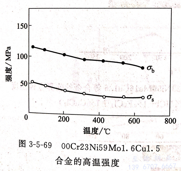 (00Cr23Ni59Mo16Cu1.6)、Hastelloy C-2000 合金的(de)力(li)學性(xing)能與 Hastelloy C系(xi)列中的(de)其他(ta)合金并無(wu)顯著差別。表3-5-80系(xi)此(ci)合金的(de)室(shi)溫(wen)力(li)學性(xing)能,圖3-5-69則系(xi)它(ta)的(de)高溫(wen)瞬(shun)時強(qiang)度。