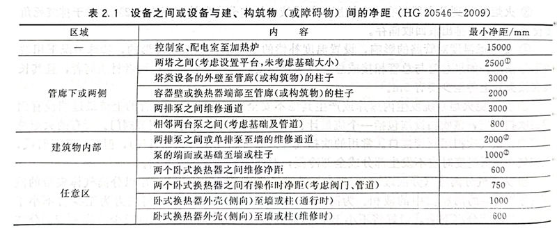 設備之間或設備建、構筑物(或障礙物)間的凈距見表2.1。