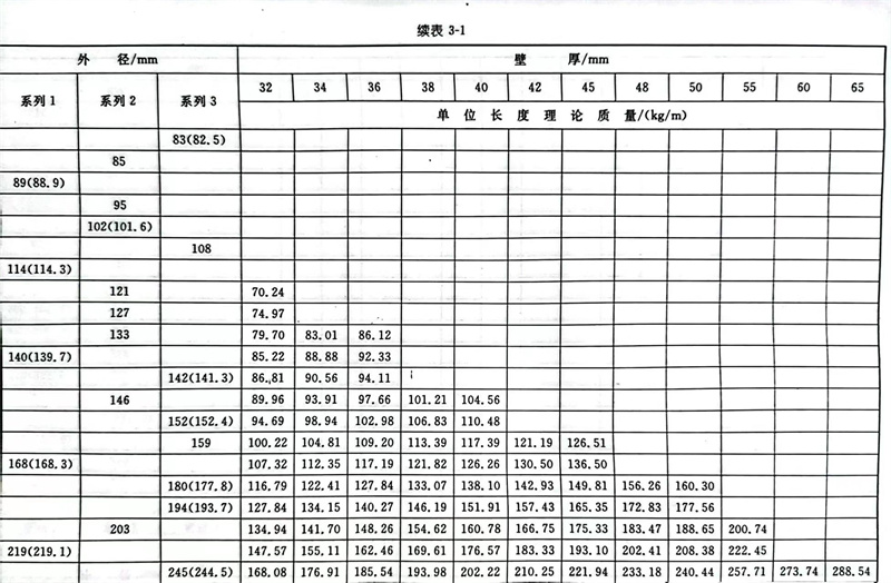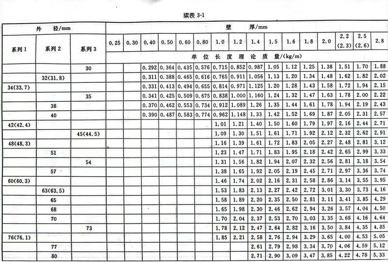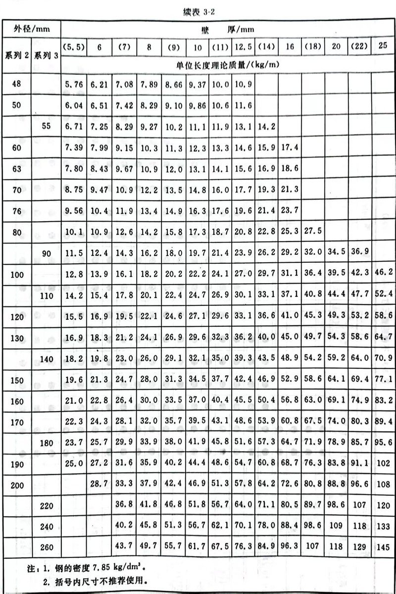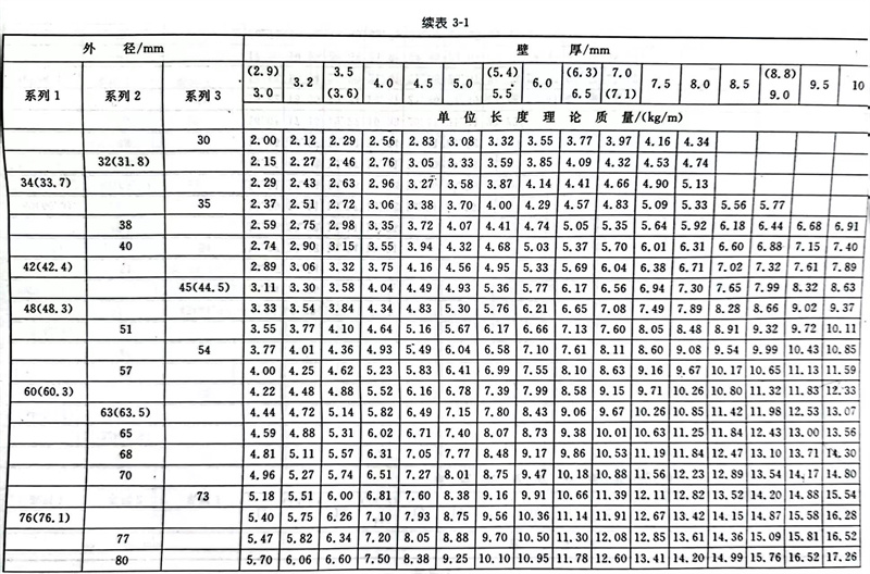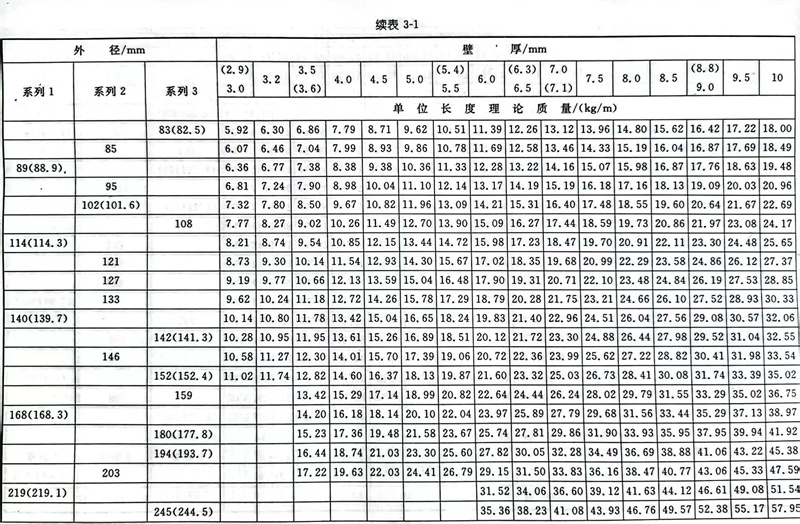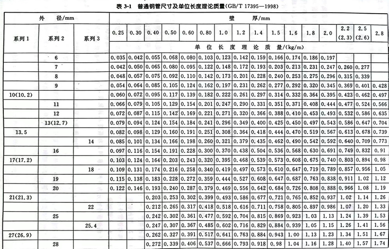 普通鋼管尺寸及單位長度的理(li)論質(zhi)量見表3-1。