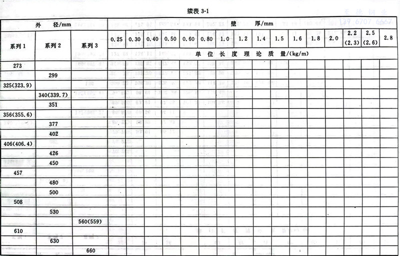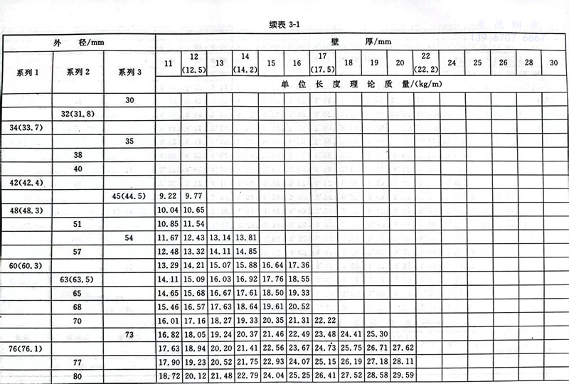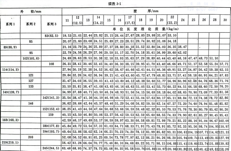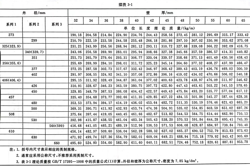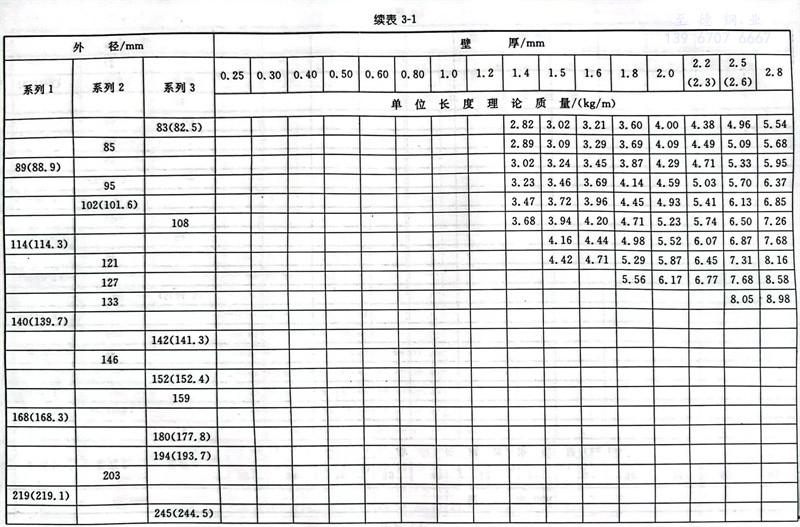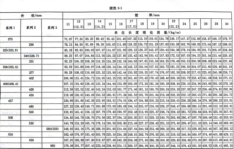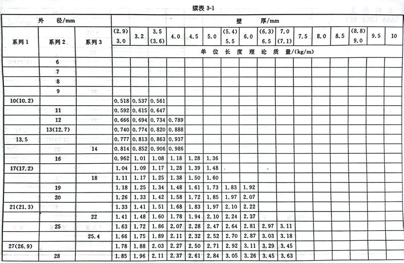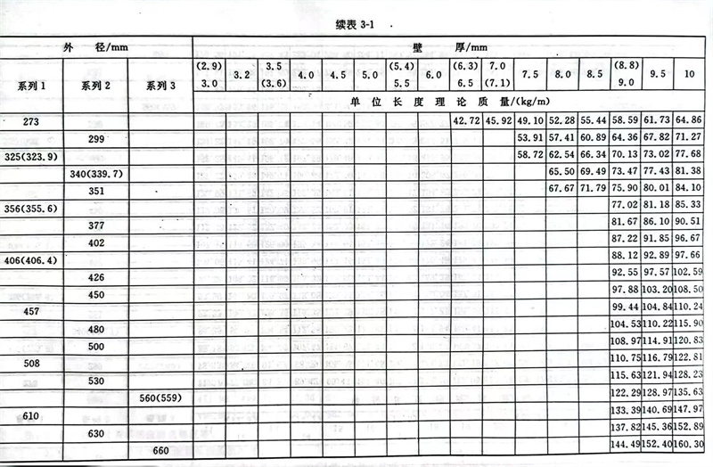 普通鋼管尺寸及單位長度的理(li)論質(zhi)量見表3-1。