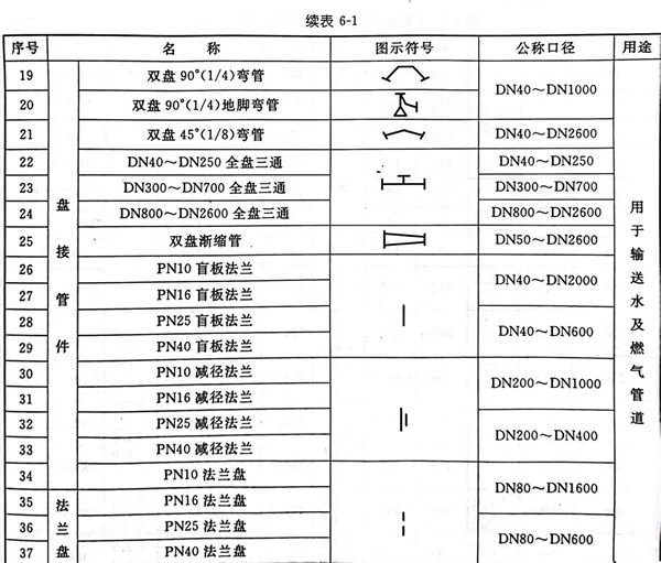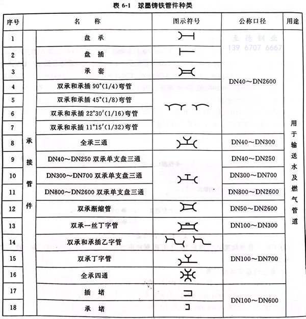 球墨鑄鐵管(guan)件的分類由各種(zhong)接口(kou)形(xing)式派生而得。球墨鑄鐵管(guan)件的種(zhong)類見表6-1。