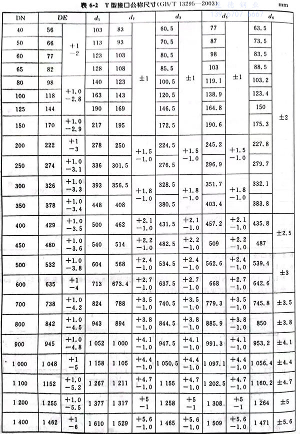 1. DN40~DN1200 T型接口球鐵管的型式見圖(tu)6-2,公稱尺(chi)寸見表6-2;DN1400T型接口球鐵管的型式見圖(tu)6-3,公稱尺(chi)寸見表6-2。