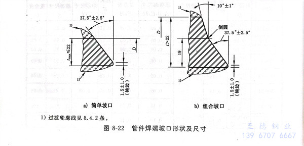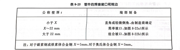 管(guan)件焊端坡口形(xing)狀及尺寸(cun)見圖8-22,管(guan)件的(de)焊接坡口和鈍邊(bian)見表8-25。