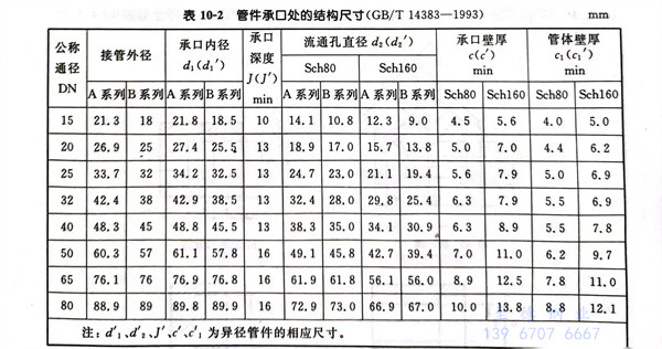 管件(按計算其壓力(li)額定值的基準管子(zi))分(fen)為(wei)Sch80和Sch160兩個等(deng)級。根據(ju)配接(jie)管子(zi)外徑的不(bu)同選擇,管件承(cheng)口內徑尺寸(d1)和流通孔直徑尺寸(d2)分(fen)別規定了(le)A、B兩個系列,推薦優先選用A系列。