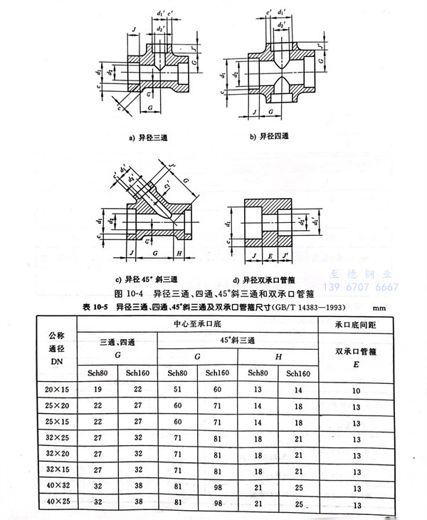 異(yi)徑三通、四通、45°斜三通和雙承口管箍型式見(jian)圖 10-4,尺寸(cun)見(jian)表(biao) 10-5 。