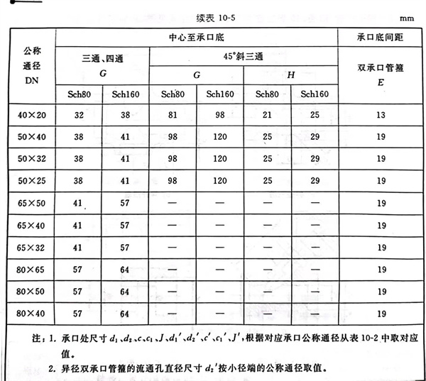 45°彎頭和90噸彎頭、三通和四通型式見圖 10-2 ,尺寸見表 10-3。