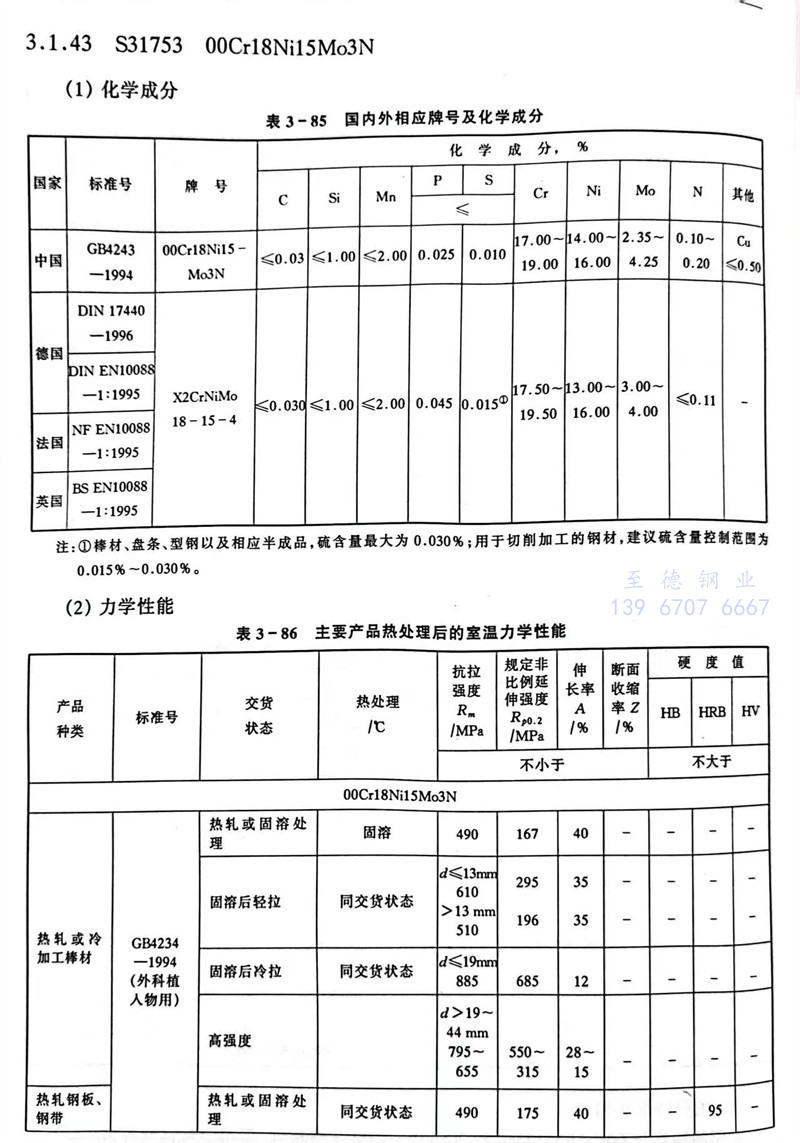 S31753 00Cr18Ni15Mo3N 不銹鋼主要(yao)特性和用途