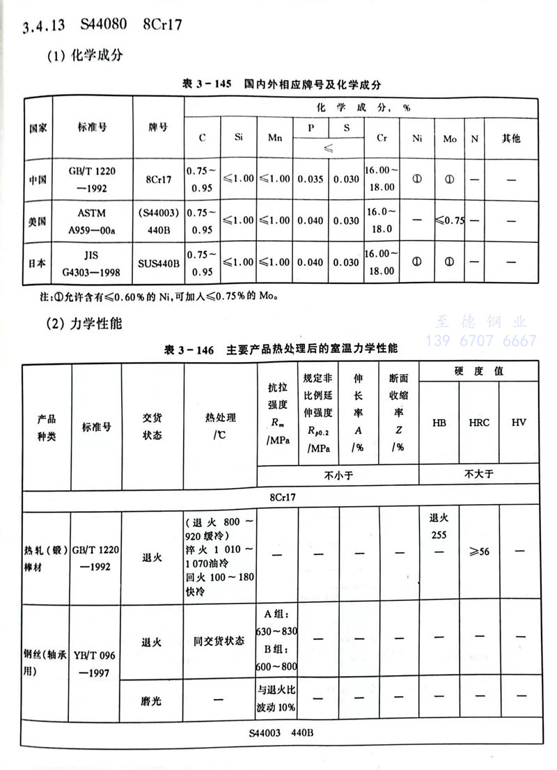 因GB/T 1220中規定(ding)可(ke)加入≤0.75%鉬(mu),所以此鋼(gang)亦可(ke)稱為8Cr17Mo鋼(gang)。其(qi)耐蝕性優(you)于不含鉬(mu)鋼(gang)。在(zai)硬化狀態(tai)下比7Cr17鋼(gang)硬,比11Cr17鋼(gang)韌性好。