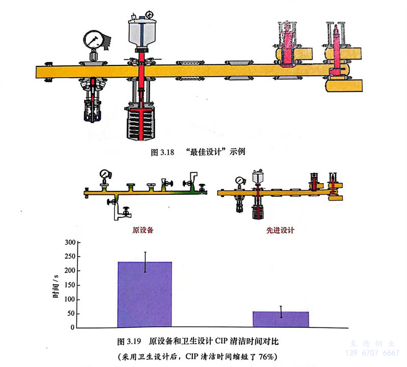 然(ran)后,他將原(yuan)設(she)(she)備設(she)(she)計(ji)與“最佳設(she)(she)計(ji)”進(jin)行了比(bi)較。最佳設(she)(she)計(ji)采(cai)用了衛生設(she)(she)計(ji)的(de)(de)原(yuan)則采(cai)用無縫(feng)隙接頭,采(cai)用平滑的(de)(de)彎(wan)管(guan),最大程度減(jian)少(shao)死角(jiao)等(圖3.18)。最先(xian)進(jin)的(de)(de)設(she)(she)計(ji)可以提高清潔效(xiao)率。