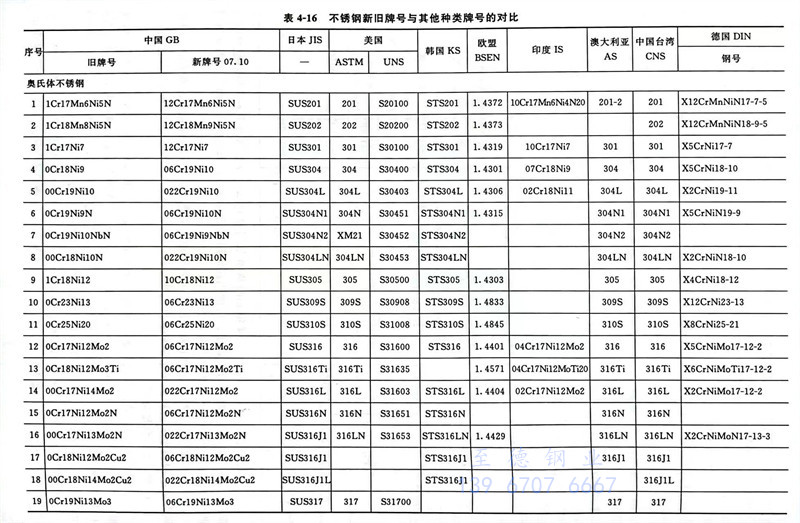 由于GB/T 20878-2007《不銹鋼和耐熱鋼 牌號及化學成分》修改了不銹鋼和耐熱鋼的牌號,有一些國內標準規范更新了,有的仍在沿用以前的牌號,因此浙江至德鋼業有限公司列出了不銹鋼新舊牌號與其他種類牌號的對比,見表4-16。