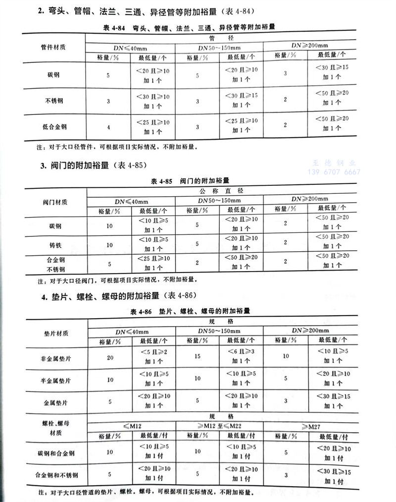⑤. 應對管子、閥門、法蘭、管件(對焊、承(cheng)插焊和(he)螺紋管件)、緊固件、墊(dian)片(pian)分別列出其余量系數。