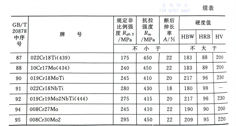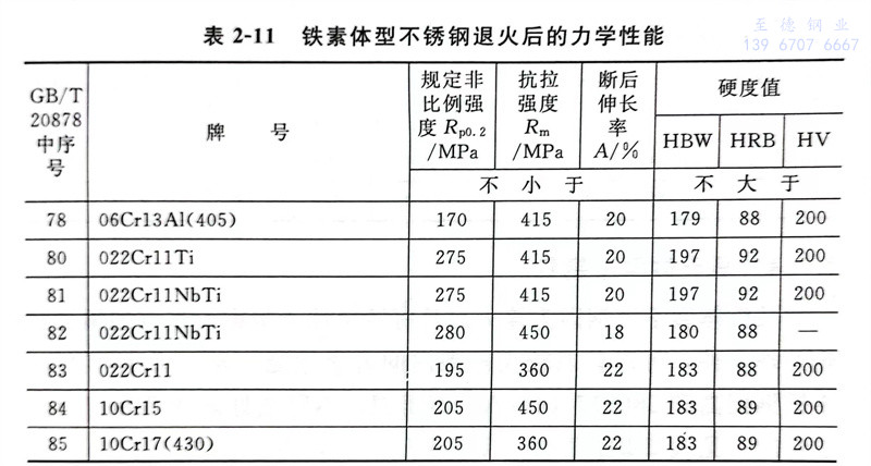鐵(tie)素體(ti)型(xing)(xing)不(bu)(bu)銹(xiu)(xiu)鋼(gang)(gang)無(wu)論是(shi)在(zai)高溫還(huan)是(shi)常(chang)溫,鐵(tie)素體(ti)相(α)是(shi)穩定的,即使(shi)是(shi)快速冷卻也(ye)無(wu)淬火(huo)硬化性。在(zai)低(di)鉻不(bu)(bu)銹(xiu)(xiu)鋼(gang)(gang)中(zhong),會引(yin)起部分的馬(ma)氏(shi)體(ti)變態(tai),但對力學性能幾乎沒(mei)有影響,低(di)鉻不(bu)(bu)銹(xiu)(xiu)鋼(gang)(gang)是(shi)在(zai)退(tui)火(huo)溫度為800~1050℃急冷的完全(quan)退(tui)火(huo)狀態(tai)下使(shi)用(yong)。鋼(gang)(gang)材的加工硬化很小,可以在(zai)冷加工后(hou)使(shi)用(yong)。鐵(tie)素體(ti)型(xing)(xing)不(bu)(bu)銹(xiu)(xiu)鋼(gang)(gang)退(tui)火(huo)后(hou)的力學性能見表2-11。