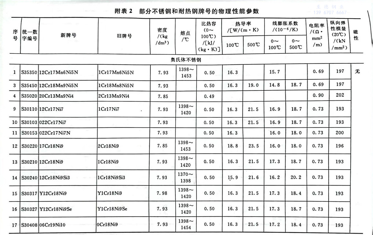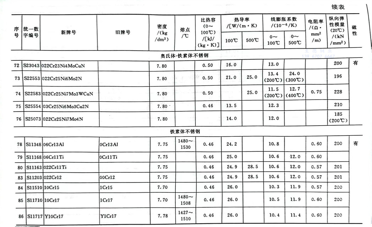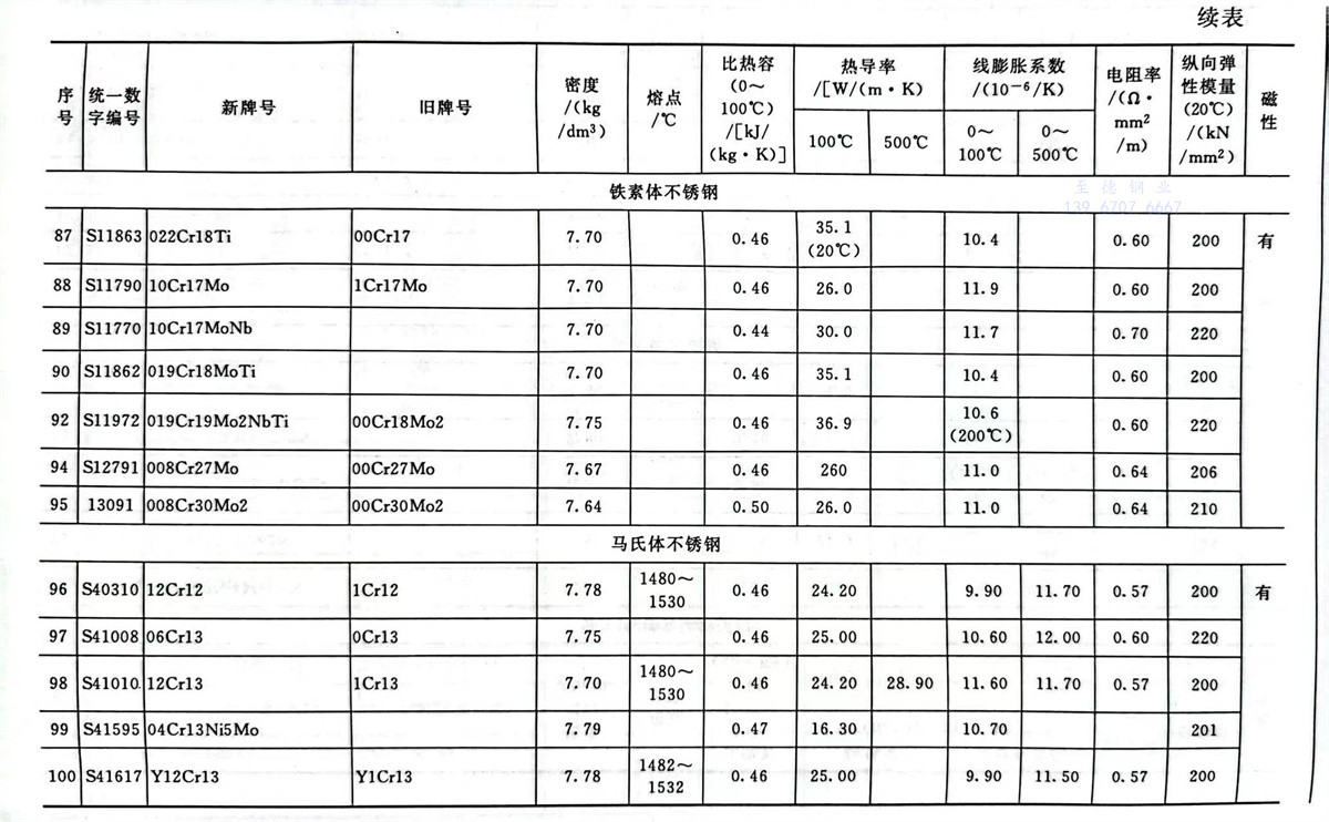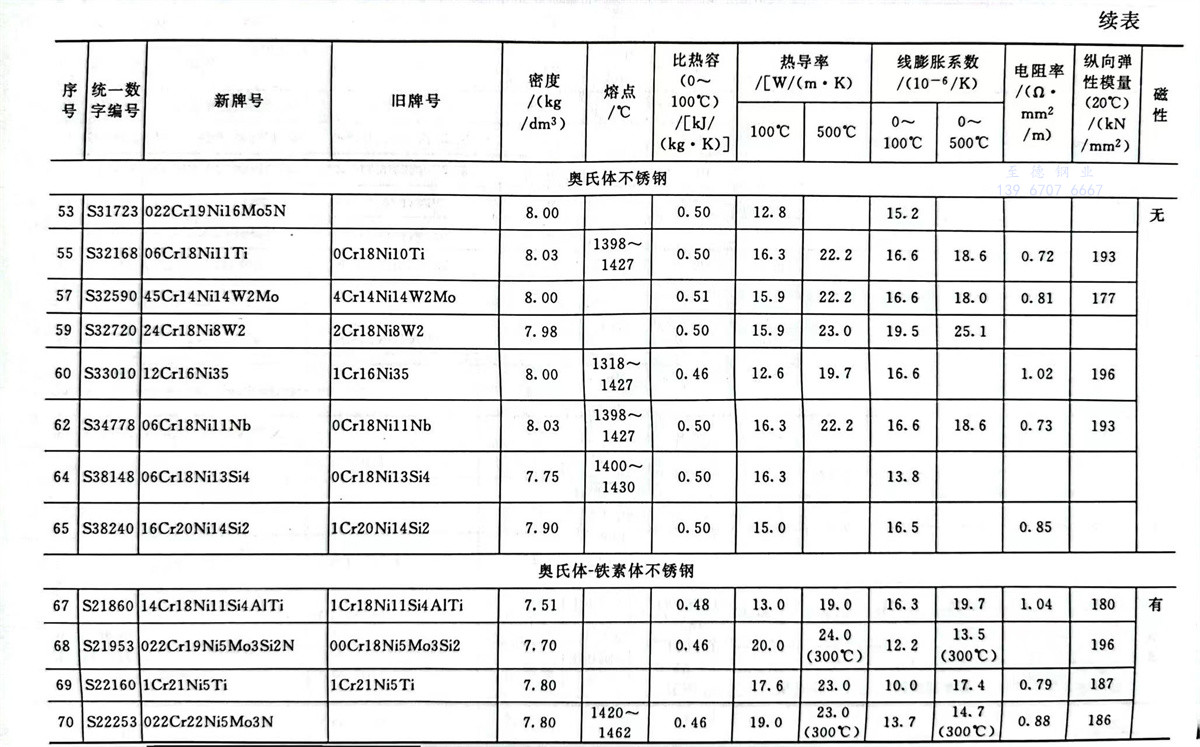 不銹鋼和耐熱鋼牌號的物理性能參數表