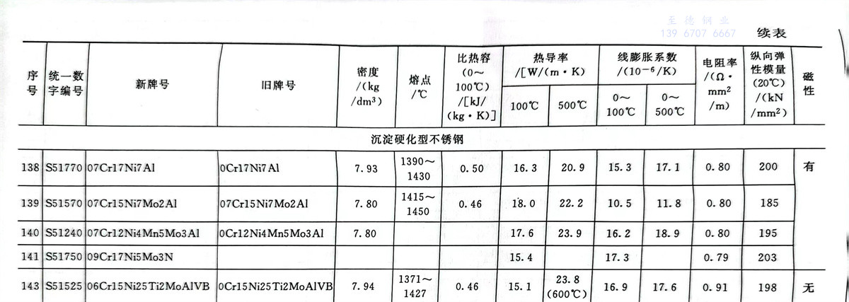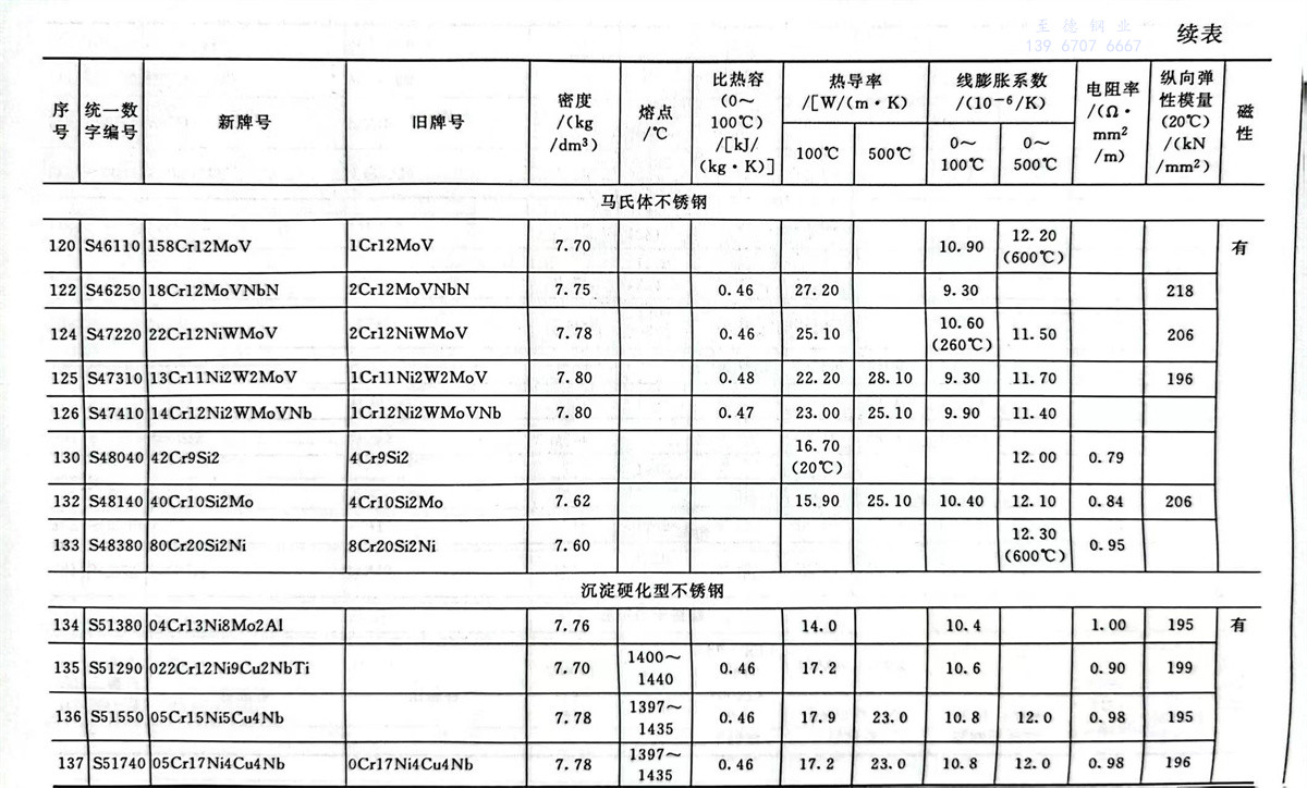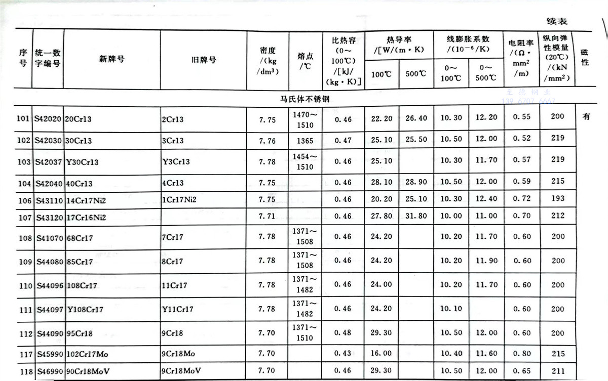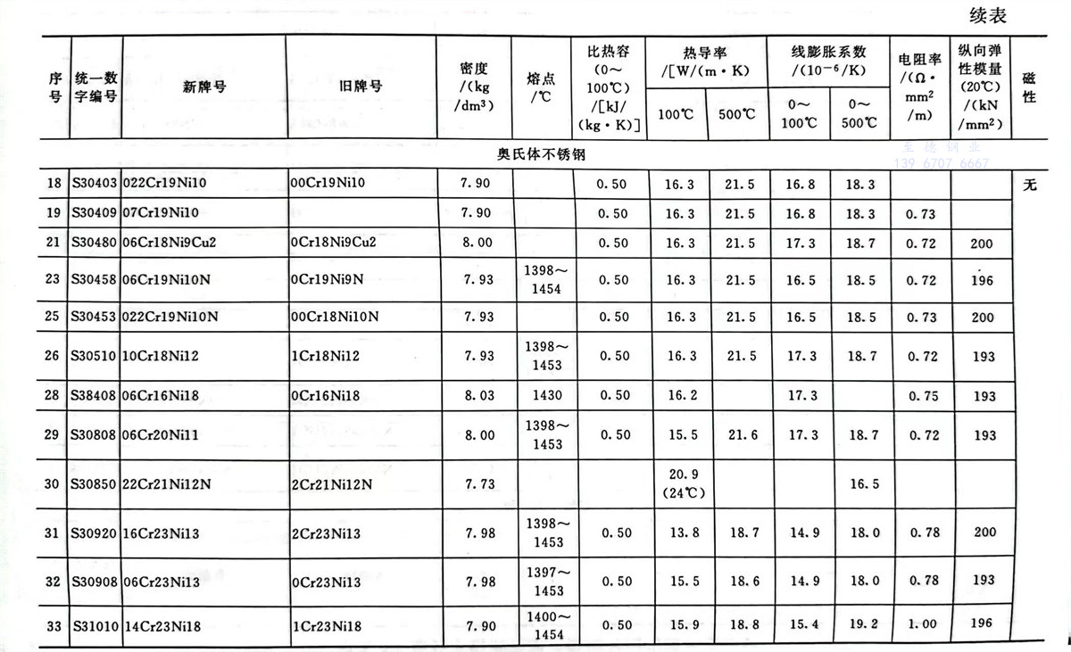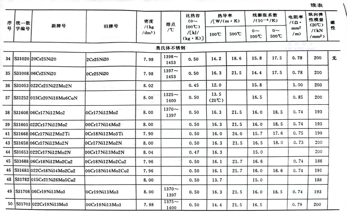 不銹鋼和耐熱鋼牌號的物理性能參數表