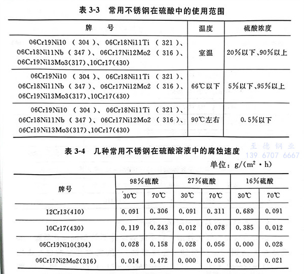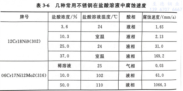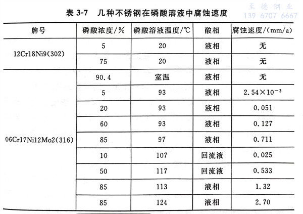 一般說來,不含Mo的不(bu)銹鋼,不能用于耐硫酸腐蝕;而含Mo:2%~3%的06Cr17Ni12Mo2、022Cr17Ni14Mo2、06Cr18Ni12Mo2Ti等,是可供選用的耐硫酸的最低牌號;同樣含Mo:2%~3%的一些雙相不銹鋼,例如,00Cr25N6NiMo2N等的耐硫酸性能相當或優于含Mo:2%~3%的Cr-Ni奧氏體鋼。高Mo(含Mo≥4%)不銹鋼的耐硫酸性能又比一般含Mo:2%~3%的鋼進一步提高。但是,當鋼中既含Mo又含Cu時,其耐硫酸性能又優于僅含Mo的不銹鋼,因而,它們的使用范圍可較僅含Mo的鋼更加擴大。而用Mo、Cu、Si(3%~4%)三元素復合金化的Cr-Ni奧氏體鋼和雙相不銹鋼則是耐硫酸不銹鋼中性能更佳,使用范圍更寬的一類。截至目前為止,高牌號耐硫酸不銹鋼,例如,0Cr23Ni28Mo3Cu3Ti、1Cr24M20Mo2Cu3、0Cr20Ni29Mo3Cu4等主要用于常壓下耐80℃以下的各種濃度硫酸。但是在90%~98%的高溫濃硫酸中,根據使用溫度和濃度,只有選用高Si:6%不銹鋼才能取得滿意的結果。幾種常用不銹鋼在不同濃度、溫度的硫酸中的腐蝕速度,見表3-4。幾種常用不銹鋼在鹽酸溶液中腐蝕速度,見表3-6。幾種常用不銹鋼在磷酸溶液中腐蝕速度,見表3-7。