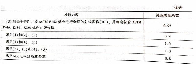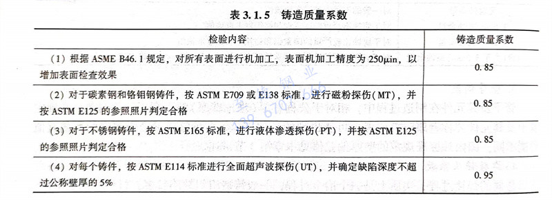 相對于軋制或鍛制的不銹鋼管道元件,鑄件缺陷相對較多,機械性能有所下降。在ASME B31.3中,為了衡量鑄件機械性能下降的程度,用鑄造質量系數來表示。鑄造質量系數同樣與無損探傷的檢驗數量有關。一般情況下,符合材料基本要求且根據MSS SP-55的規定已經過肉眼檢驗的靜態鑄件,可取其基本鑄造質量系數為0.8,對每一鑄件進行補充檢驗后可以按表3.1.5的要求提高。鑄件用作壓力管道及其元件的情況并不多,DN≥50閥門的閥體常采用鑄件,閥門閥體的強度設計一般由制造商進行,多數閥門標準已經給出了最小壁厚要求,實際管道設計中很少用到鑄造質量系數這個概念。ASME B31.3規定,用于劇烈操作條件下及工藝介質管道上的焊接和鑄造不銹鋼管件,其焊接質量系數和鑄造質量系數均不得低于0.9。在國內外管道設計標準規范中,有鑄造質量系數的規定。例如,GB 50316規定:如對鑄件進行補充檢測,質量系數可提高至表內規定的數值,但在任何情況下,質量系數不應超過1.00。
