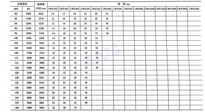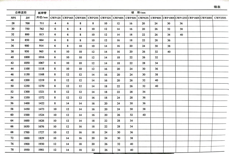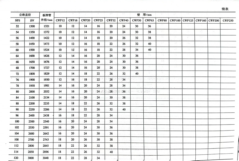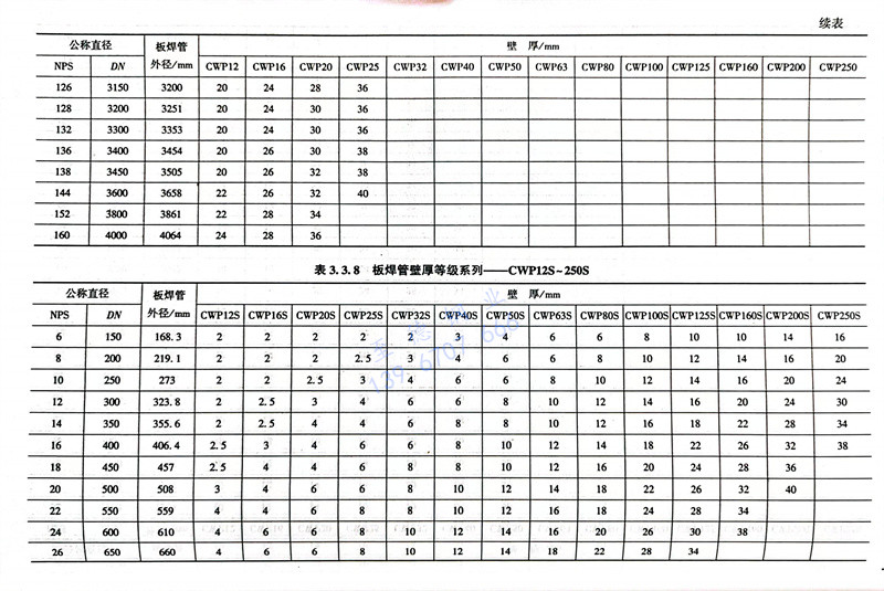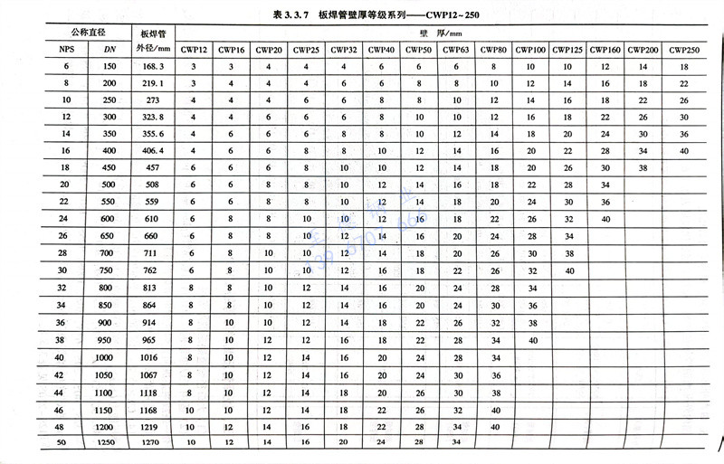 (4)CWP含義:①. 數值(zhi)相當于許用應力(li)與焊接質(zhi)量(liang)系(xi)數的乘積,等(deng)于125MPa時鋼管(guan)的承(cheng)壓(ya)能力(li)(bar)。②. 按(an)兩種(zhong)腐蝕余量(liang)(0,1.5mm)設(she)置。③. 其(qi)中(zhong)CWP 12、16、20、25、32、40、50、63、80、100、125、160、200、250共14個。④. 其(qi)中(zhong)CWP 12S、16S、20S、25S、32S、40S、50S、63S、80S、100S、125S、160S、200S、250S共14個。⑤. 最大厚度40mm。板(ban)焊管(guan)壁厚等(deng)級系(xi)列-CWP12~250見表3.3.7,板(ban)焊管(guan)壁厚等(deng)級系(xi)列CWP12S~250S見表3.3.8。