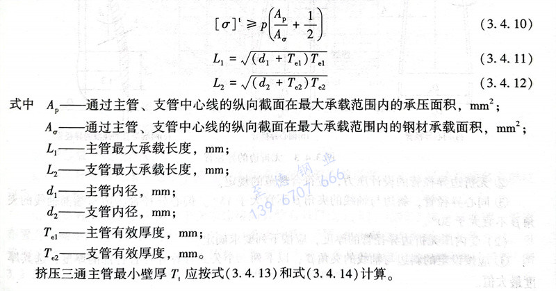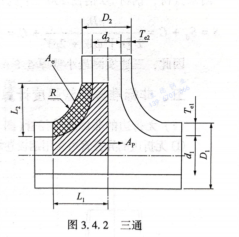擠壓(ya)不銹鋼三(san)(san)通的(de)壁厚計算應(ying)(ying)采用(yong)(yong)壓(ya)力面(mian)積法,計算時,應(ying)(ying)控制三(san)(san)通承(cheng)載截(jie)面(mian)上的(de)一(yi)次(ci)應(ying)(ying)力不超過材料在(zai)工(gong)作溫度下的(de)許用(yong)(yong)應(ying)(ying)力,許用(yong)(yong)應(ying)(ying)力應(ying)(ying)按式(3.4.10)計算。承(cheng)受內(nei)壓(ya)的(de)三(san)(san)通外形見圖3.4.2承(cheng)載區的(de)尺寸應(ying)(ying)按式(3.4.11)和式(3.4.12)計算。