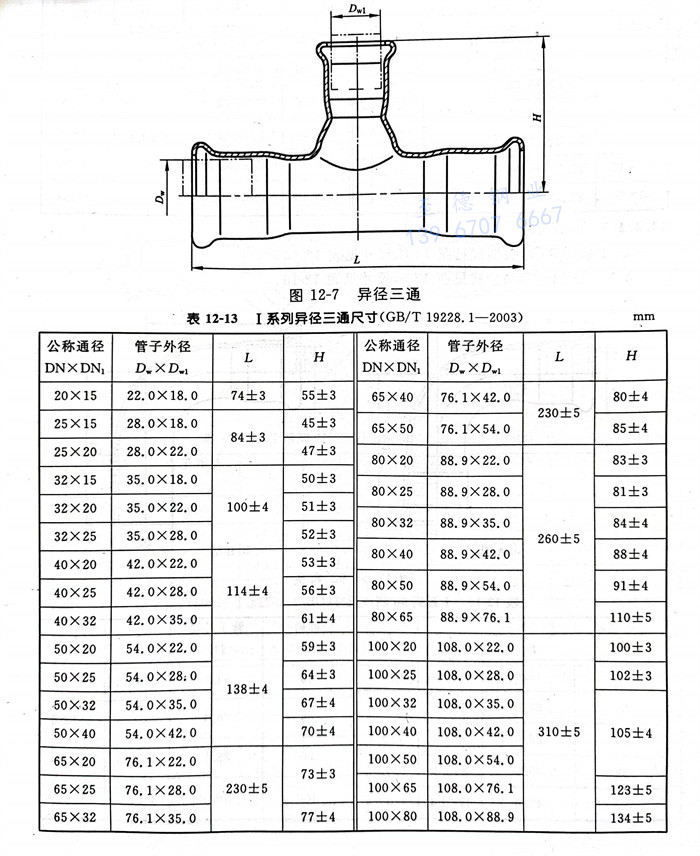 a.Ⅰ系列(lie)異徑(jing)三通型(xing)式見圖12-7,尺寸見表12-13。