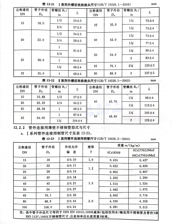 現行不(bu)銹鋼卡(ka)壓式管(guan)件國家標準有:GB/T 19228.1-2003《不銹鋼卡壓式管件》、GB/T 19228.2-2003《不銹鋼卡壓式管件連接用薄壁不(bu)銹鋼管》及GB/T 19228.3-2003《不銹鋼卡壓式管件用橡膠O形密封圈》。GB/T 19228.1所規定的不銹鋼卡壓式管件結構尺寸及承口部連接尺寸共分為兩個系列:I系列尺寸與德國煤氣和給水專業人員聯合會規程 DVGW W534:1995《飲水裝置中的管接頭》標準中不銹鋼卡壓式管件的尺寸等同;II系列尺寸與日本自來水協會標準JWWA G116-2001《供水管道用不銹鋼管接頭》的尺寸等同。GB/T 19228.2中,對于Ⅰ系列管件用薄壁不(bu)銹鋼管的管子外徑與歐共體標準DIN EN 10312:1999《液體(包括飲用水)輸送用不銹鋼管及管件》相一致;對于II系列管件用薄壁不銹鋼管的管子外徑,則與日本標準JIS G3448-1997《一般管道用不銹鋼管》相一致。GB/T 19228.3中,關于密封圈的物理性能,主要參考采用了歐共體標準EN 681-1:1998《彈性密封件 給排水用管道連接密封件的材料要求 第1部分:硫化橡膠》的要求。