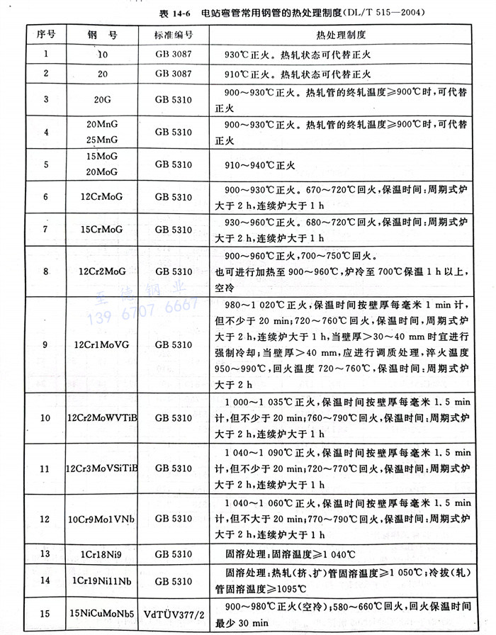 電站(zhan)彎管(guan)常用鋼管(guan)的熱處理制度見表 14-6