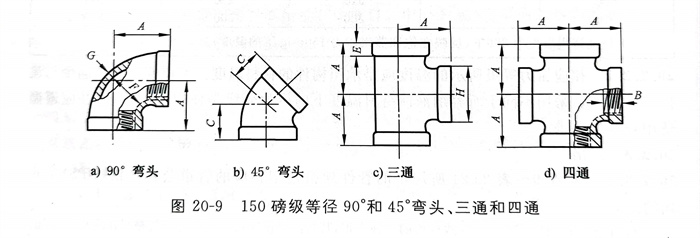150磅級等徑(jing)90°和45°彎(wan)頭、三通和四通型式見圖20-9,尺寸見表20-9。