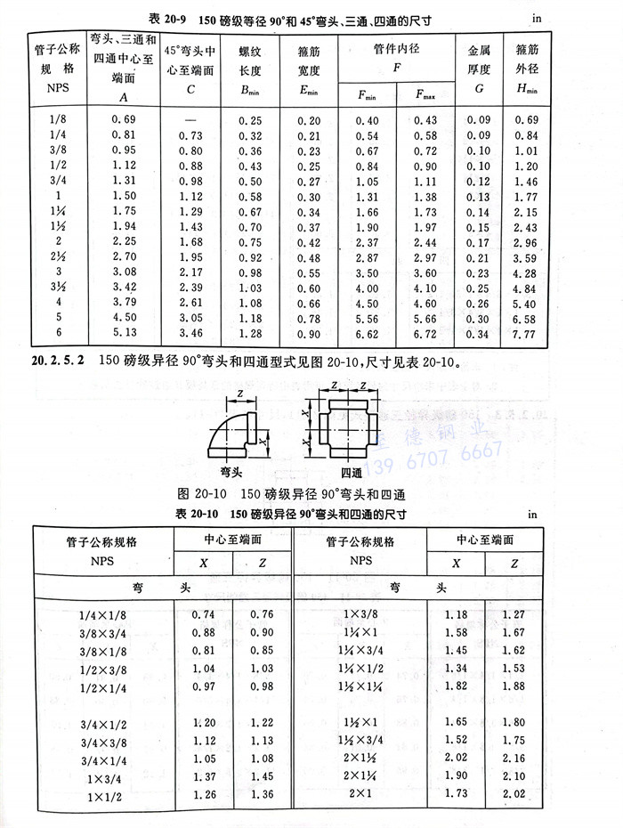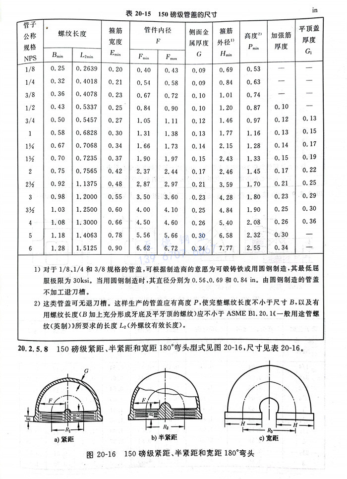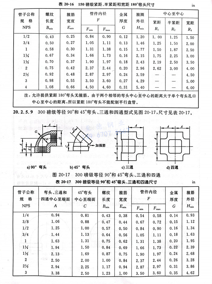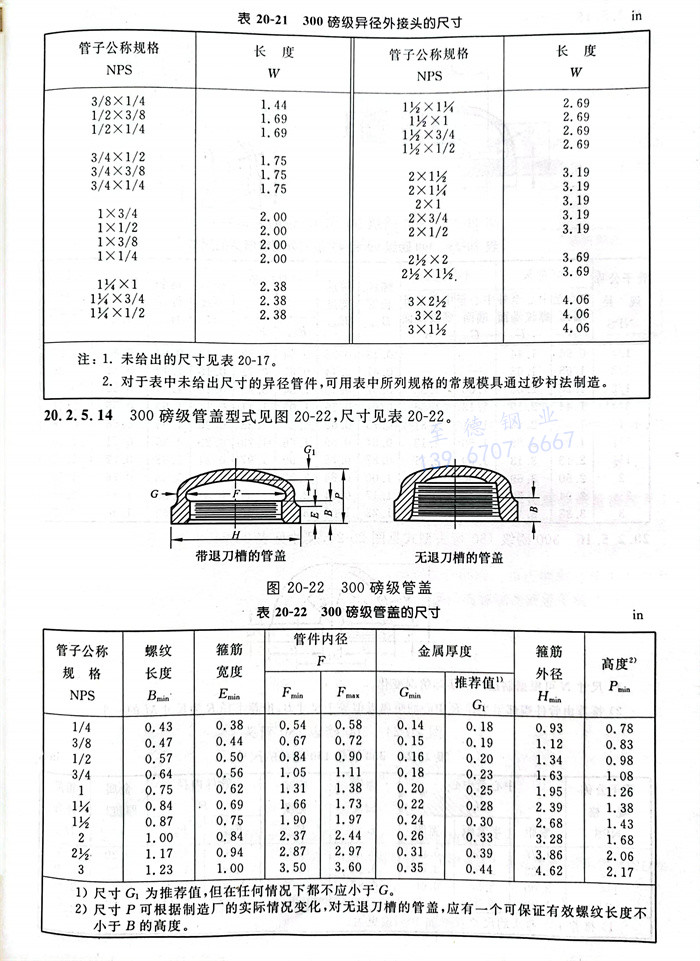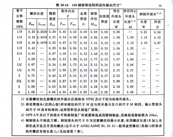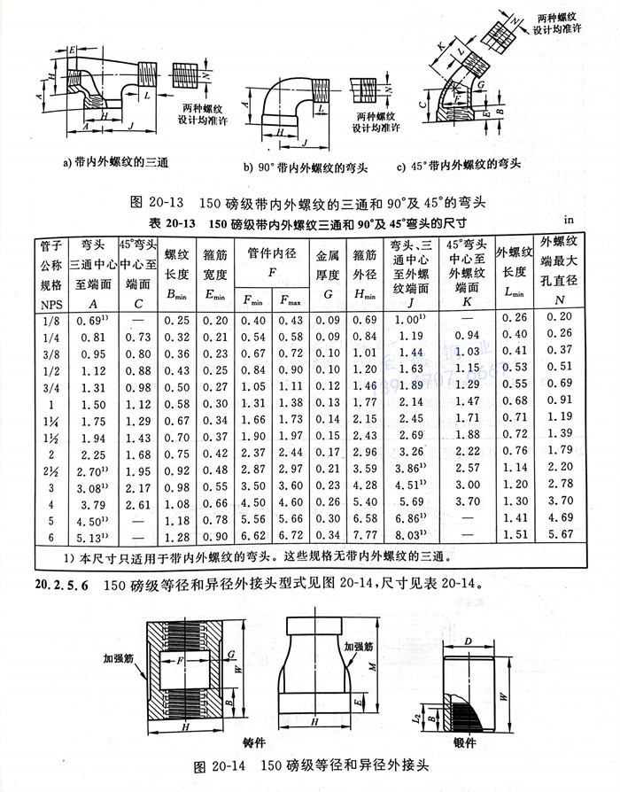 所有(you)管(guan)件均應(ying)按ASME B1.20.1《一般用(yong)途的英制管(guan)螺(luo)紋》加工螺(luo)紋,除NPS 1/8、NPS 1/4和(he)NPS 3/8規格的鍛軋(ya)接頭(表(biao)20-14)和(he)管(guan)蓋(gai)(表(biao)20-15)可用(yong)圓(yuan)柱(zhu)管(guan)螺(luo)紋外,其(qi)他(ta)所有(you)管(guan)件均應(ying)為(wei)錐管(guan)螺(luo)紋。