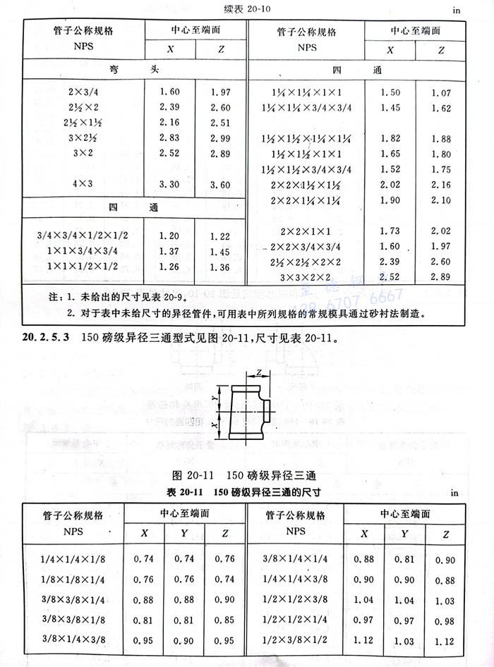 150磅級異徑90°彎頭和四通型式見圖20-10,尺(chi)寸見表20-10。