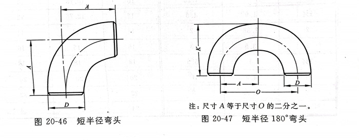 米制短半(ban)徑180°彎(wan)頭(tou)的型式(shi)見圖20-47,尺寸見表20-66;英制短半(ban)徑180°彎(wan)頭(tou)型式(shi)見圖20-47,尺寸見表20-67。