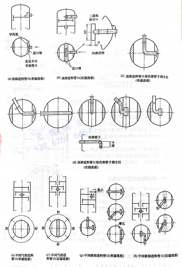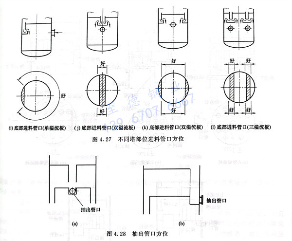 b. 中間進(jin)料(liao)。氣相進(jin)料(liao)管口方(fang)(fang)位(wei)見圖4.27(e)、(f)。液相進(jin)料(liao)管口方(fang)(fang)位(wei)見圖4.27(g)、(h)。