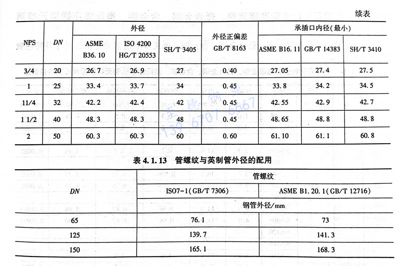 ②. 螺(luo)紋(wen)管件,閥門的螺(luo)紋(wen)型式(NPT、R、Rc、Rp)與鋼(gang)管外徑(jing)的配合見表4.1.13。