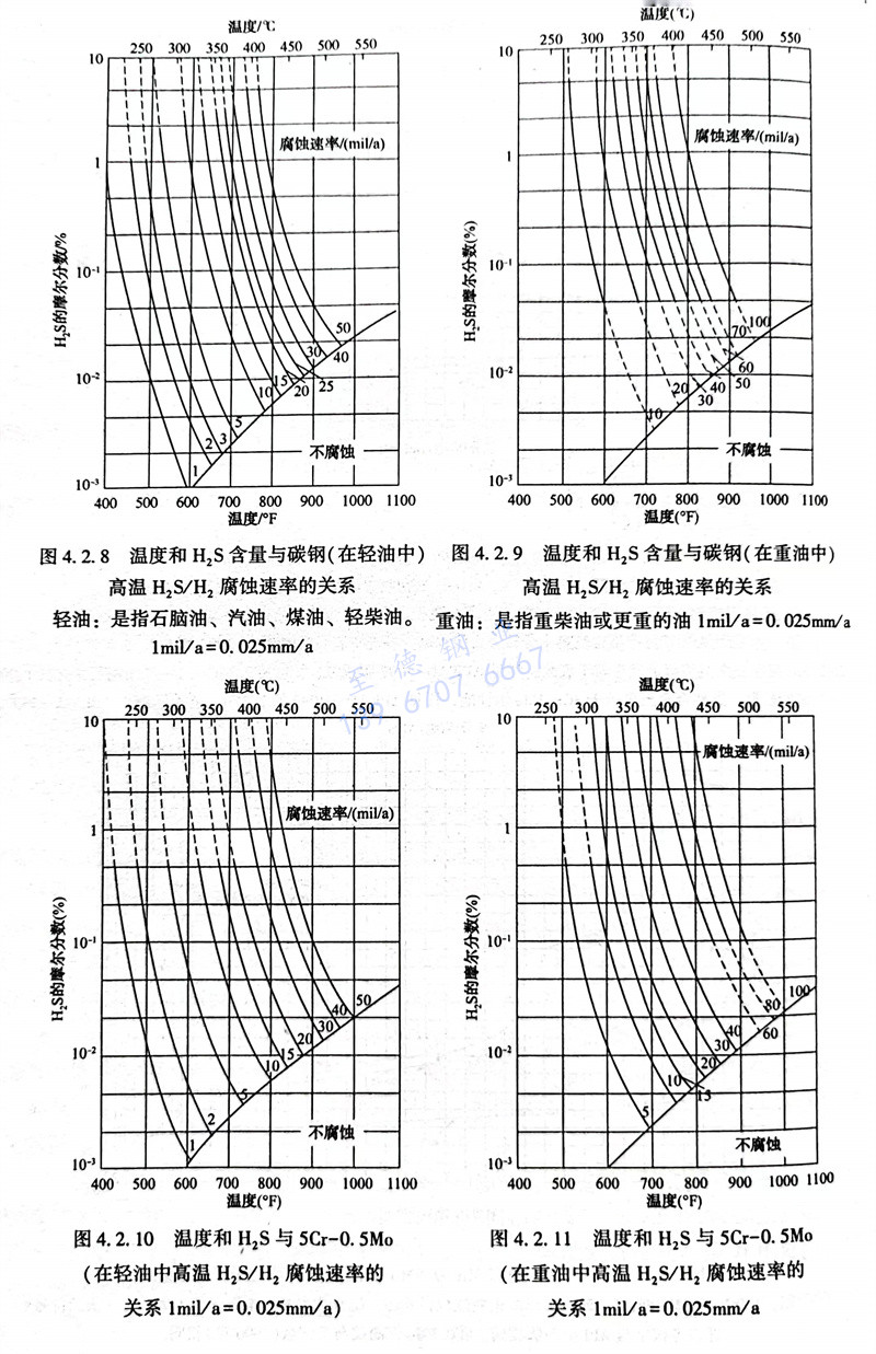 (9)對操作溫度等于或高于250℃、介質為H2S+H2的材料,應根據高溫H2S+H2對各鋼種的腐蝕率按圖4.2.8~圖4.2.15選用(最新版“柯柏曲線”,SH/T3129《加工高硫原油重點裝置主要管道設計選材導則》和SY/T 0599《天然氣地面設施抗硫化物應力開裂和抗應力腐蝕開裂的金屬材料要求》均有此規定)。