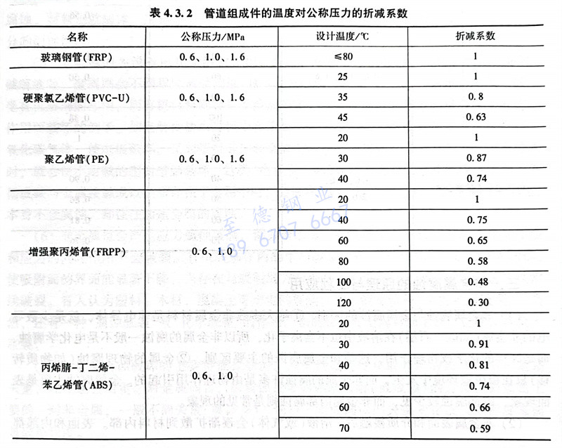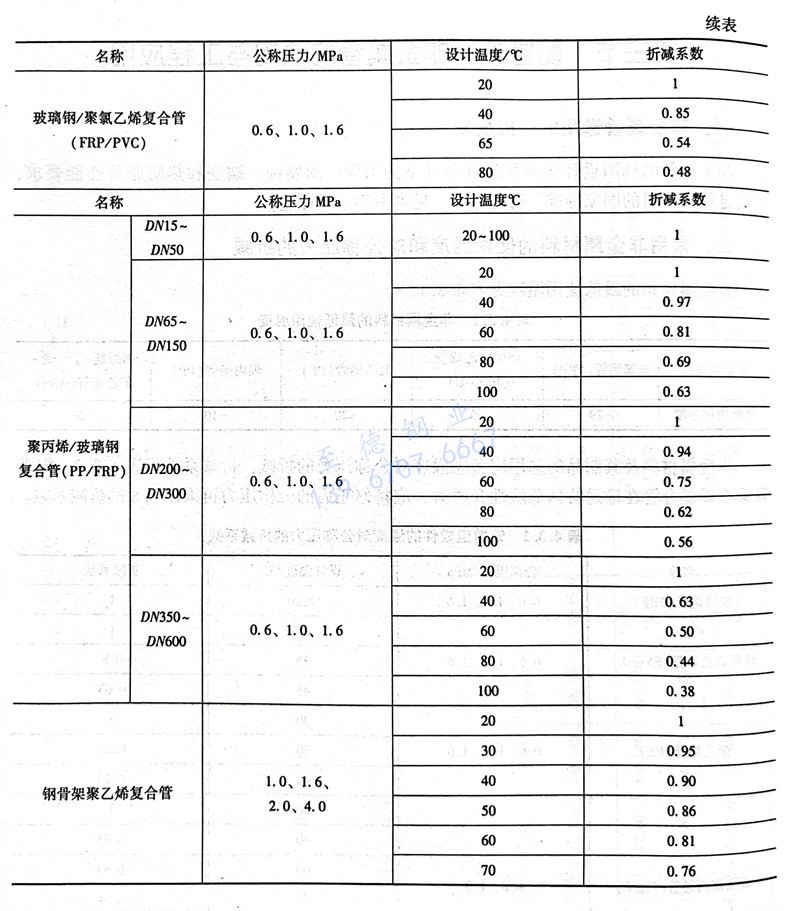 非金屬材料及其(qi)制(zhi)品的選用應考慮溫(wen)度對(dui)公(gong)稱(cheng)壓力的折(zhe)(zhe)減,折(zhe)(zhe)減系(xi)數見表4.3.2。鋼骨(gu)架(jia)聚乙(yi)烯復合管在(zai)輸(shu)送特殊(shu)危(wei)險性介質時,應將修正(zheng)后的公(gong)稱(cheng)壓力再(zai)乘以0.8的折(zhe)(zhe)減系(xi)數。