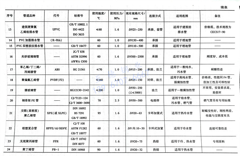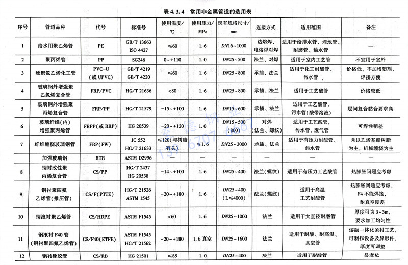 非金(jin)屬材料(liao)的(de)選用須重點考慮其加工工藝性和連接性,常(chang)用非金(jin)屬管(guan)道的(de)選用表(biao)見表(biao)4.3.4。