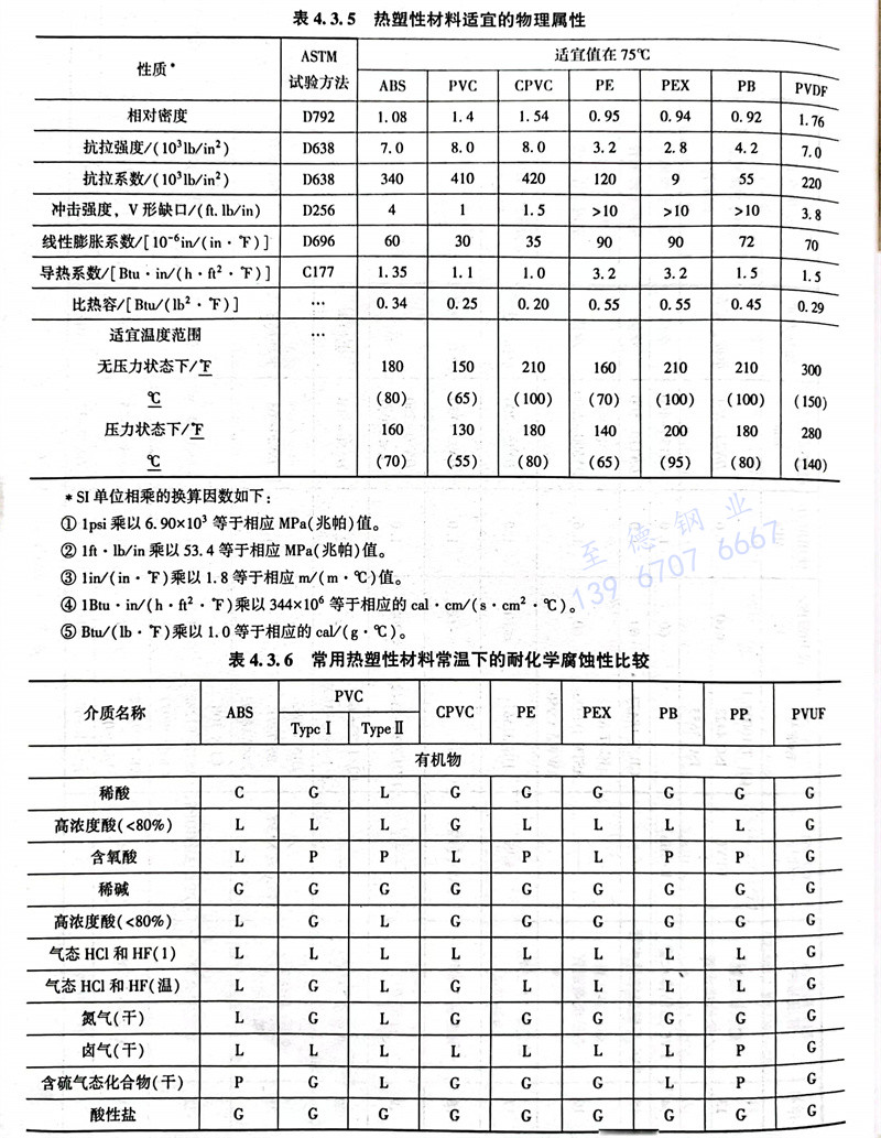 熱塑性材料(liao)適宜的物理屬(shu)性見(jian)表(biao) 4.3.5 ,常用熱塑性材料(liao)常溫下(xia)的耐化學(xue)性腐(fu)蝕比較 見(jian)表(biao) 4.3.6
