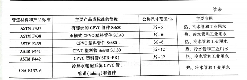 氯(lv)化聚氯(lv)乙烯(過氯(lv)乙烯)(CPVC)是PVC的(de)化學(xue)改良(liang)品種,它的(de)許多性(xing)能(neng)同PVC是非常相(xiang)似(si)的(de)。包(bao)活在室溫時的(de)強(qiang)度和(he)剛性(xing),但在CPVC的(de)化學(xue)結構(gou)中,增(zeng)加了一個(ge)氯(lv)原子,CPVC的(de)最(zui)大(da)操作溫度比PVC材料增(zeng)加了50F(28℃)。CPVC的(de)主(zhu)要用途為家用的(de)冷熱水管道(dao)、滅火管道(dao),因其耐高溫能(neng)力好和(he)優良(liang)的(de)耐腐蝕性(xing)能(neng)而在工(gong)程上應(ying)用。CPVC管道(dao)標(biao)準見表(biao)4.3.8。