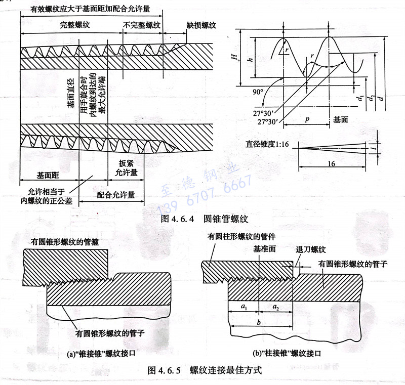 ①. 常(chang)用(yong)(yong)(yong)材料有(you)鍛鋼(gang)、鑄鋼(gang)、鑄鐵(tie)、可鍛鑄鐵(tie),石油化工(gong)裝(zhuang)置的(de)工(gong)藝管(guan)(guan)(guan)道大(da)多(duo)選用(yong)(yong)(yong)鍛鋼(gang)制錐(zhui)(zhui)管(guan)(guan)(guan)螺(luo)紋(wen)(wen)管(guan)(guan)(guan)件(jian)。常(chang)用(yong)(yong)(yong)鍛鋼(gang)制螺(luo)紋(wen)(wen)管(guan)(guan)(guan)件(jian)的(de)標(biao)準有(you)HG/T 21632、GB/T 14626、GB/T 19326、ASMEB16.1、GB/T 3287、MSS SP83《活接(jie)(jie)(jie)(jie)頭(tou)》、MSSSP97《支管(guan)(guan)(guan)臺》、MSS SP95《異徑短管(guan)(guan)(guan)及管(guan)(guan)(guan)堵》、GB/T 8464《水暖內螺(luo)紋(wen)(wen)》、API 602《小口徑閘閥》。螺(luo)紋(wen)(wen)連(lian)(lian)接(jie)(jie)(jie)(jie)也多(duo)用(yong)(yong)(yong)于DN≤40的(de)管(guan)(guan)(guan)子及其元(yuan)件(jian)之間(jian)的(de)連(lian)(lian)接(jie)(jie)(jie)(jie)。常(chang)用(yong)(yong)(yong)于不宜(yi)焊接(jie)(jie)(jie)(jie)或需(xu)要可拆卸的(de)場合。螺(luo)紋(wen)(wen)連(lian)(lian)接(jie)(jie)(jie)(jie)件(jian)有(you)陽螺(luo)紋(wen)(wen)(male screw)和陰(yin)螺(luo)紋(wen)(wen)(femalescrew)之分。管(guan)(guan)(guan)螺(luo)紋(wen)(wen)分圓(yuan)錐(zhui)(zhui)管(guan)(guan)(guan)螺(luo)紋(wen)(wen)和圓(yuan)柱管(guan)(guan)(guan)螺(luo)紋(wen)(wen)兩種,管(guan)(guan)(guan)螺(luo)紋(wen)(wen)如圖(tu)4.6.3、圖(tu)4.6.4所(suo)示,在管(guan)(guan)(guan)連(lian)(lian)接(jie)(jie)(jie)(jie)中常(chang)被采用(yong)(yong)(yong)。如一般把管(guan)(guan)(guan)件(jian)、設備(bei)加工(gong)成圓(yuan)柱形(xing)(xing)內螺(luo)紋(wen)(wen),把管(guan)(guan)(guan)子加工(gong)成圓(yuan)錐(zhui)(zhui)形(xing)(xing)外螺(luo)紋(wen)(wen),除安裝(zhuang)方(fang)便外且密封(feng)性能好,可鍛鑄鐵(tie)管(guan)(guan)(guan)件(jian)大(da)都采用(yong)(yong)(yong)錐(zhui)(zhui)形(xing)(xing)內螺(luo)紋(wen)(wen),它與(yu)管(guan)(guan)(guan)子圓(yuan)錐(zhui)(zhui)形(xing)(xing)外螺(luo)紋(wen)(wen)連(lian)(lian)接(jie)(jie)(jie)(jie),效果(guo)極佳。管(guan)(guan)(guan)連(lian)(lian)接(jie)(jie)(jie)(jie)中的(de)“錐(zhui)(zhui)接(jie)(jie)(jie)(jie)錐(zhui)(zhui)”螺(luo)紋(wen)(wen)接(jie)(jie)(jie)(jie)口和“柱接(jie)(jie)(jie)(jie)錐(zhui)(zhui)”螺(luo)紋(wen)(wen)接(jie)(jie)(jie)(jie)口如圖(tu)4.6.5所(suo)示。