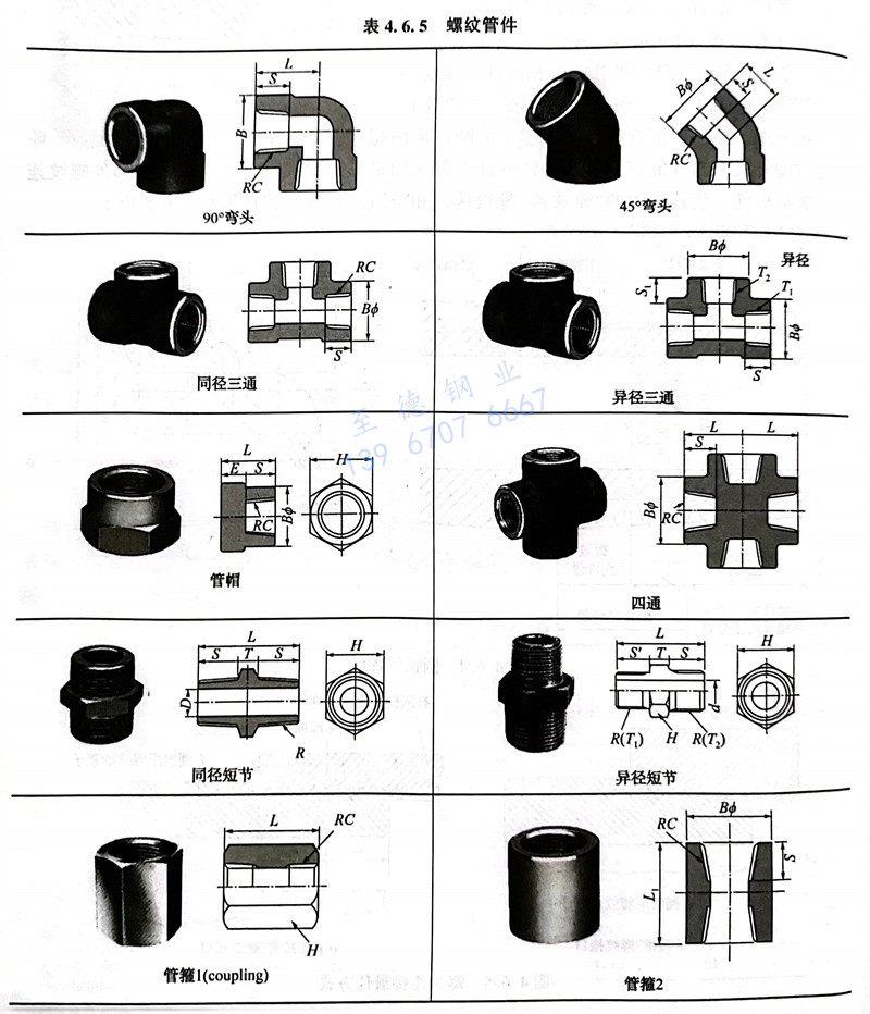 ③. 常用(yong)的不銹鋼管(guan)件中,螺紋短(duan)節為陽螺紋,而彎頭、三(san)通、管(guan)帽、活接頭等多為陰螺紋,使用(yong)時(shi)應注意它(ta)們之間(jian)的搭配和(he)組(zu)合。螺紋管(guan)件見表4.6.5。