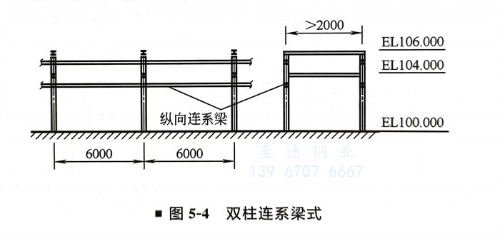 ②. 雙(shuang)柱(zhu)連系(xi)梁式:寬度在2m以(yi)上(shang),分單層(ceng)(ceng)與雙(shuang)層(ceng)(ceng),根據需要也可以(yi)多(duo)層(ceng)(ceng),如果(guo)管(guan)廊兩(liang)側(ce)進出管(guan)線(xian)多(duo)時,一(yi)般(ban)在該層(ceng)(ceng)橫梁頂部以(yi)下750~1250mm處加(jia)縱向連系(xi)梁,以(yi)支撐側(ce)向進出管(guan)線(xian),如圖5-4所示。