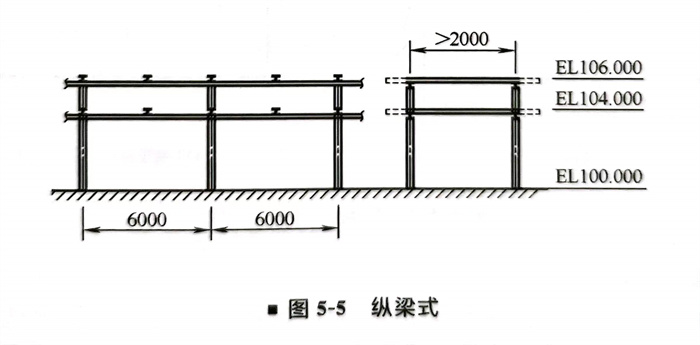 ③. 縱(zong)梁式:分單柱和雙柱結構,雙柱縱(zong)梁式一般為多層(ceng)結構,這種管廊(lang)的特點是管廊(lang)之間設有縱(zong)梁,可(ke)以根(gen)據管道允許跨距在縱(zong)梁間加支(zhi)撐用次梁,如圖5-5所示。