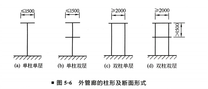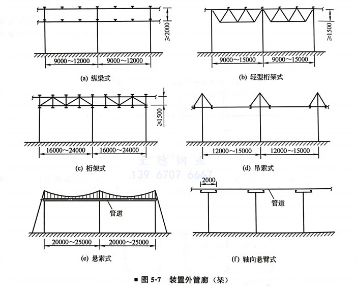 裝置外管廊(lang)(lang)一般(ban)分為單柱(T形)式(shi)(shi)和(he)雙柱(II形)式(shi)(shi)。單柱管廊(lang)(lang)一般(ban)為單層(ceng)(ceng),必(bi)要時也(ye)可采用(yong)雙層(ceng)(ceng)。雙柱管廊(lang)(lang)根據需要可分為單層(ceng)(ceng)、雙層(ceng)(ceng)及(ji)多層(ceng)(ceng)。如圖5-6所示。