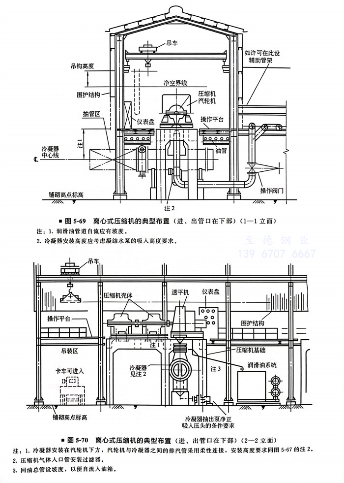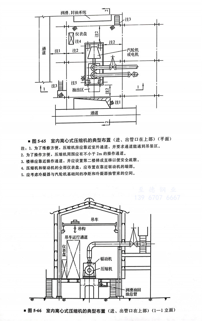 ②. 離心式(shi)壓縮(suo)機的進、出口在(zai)機體下部且附屬設備較多時,宜兩層(ceng)布置(zhi)(zhi)(zhi),上層(ceng)布置(zhi)(zhi)(zhi)機組,下層(ceng)布置(zhi)(zhi)(zhi)附屬設備,壓縮(suo)機的安(an)裝高度,除滿(man)足(zu)其附屬設備的安(an)裝以(yi)外還應滿(man)足(zu)下述要求。